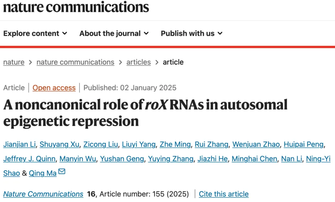 2025年1月2日,中國科學院深圳先進技術研究院合成生物學研究所的馬晴研究員團隊在《Nature Communications》雜志在線發表了題為“A noncanonical role of roX?RNAs in autosomal epigenetic repression”的最新研究成果,揭示了果蠅長非編碼RNA roX在常染色體上的非經典表觀抑制功能。這項研究不僅打破了傳統認知,還加深了我們對RNA在基因表達調控中復雜作用的理解,同時為合成生物學中非編碼RNA工具的開發提供了重要線索。
