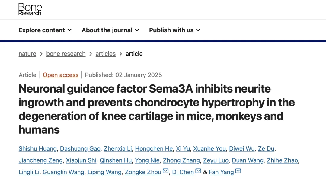 2025年1月2日,中國科學院深圳先進技術研究院腦認知與腦疾病研究所楊帆研究員團隊、生物醫藥與技術研究所陳棣教授團隊聯合四川大學華西醫院周宗科主任團隊在這一領域取得重要突破,相關研究“Neuronal guidance factor Sema3A inhibits neurite ingrowth and prevents chondrocyte hypertrophy in the degeneration of knee cartilage in mice,monkeys and humans”發表在Bone Research雜志。