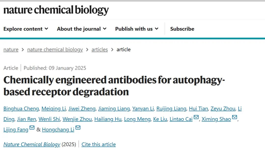 1月9日,由中國(guó)科學(xué)院深圳先進(jìn)技術(shù)研究院(簡(jiǎn)稱“深圳先進(jìn)院”)醫(yī)藥所納米醫(yī)療技術(shù)研究中心李紅昌研究員、房麗晶研究員、蔡林濤研究員和邵喜明副研究員組成的學(xué)科交叉團(tuán)隊(duì),在國(guó)際知名期刊Nature Chemical Biology上以“Chemically Engineered Antibodies for Autophagy-based Receptor Degradation”為題發(fā)表最新研究成果。在這項(xiàng)研究中,他們成功開發(fā)出一種全新的基于自噬機(jī)制的細(xì)胞膜蛋白靶向降解技術(shù)——AUTAB(autophagy-inducing antibody)。該技術(shù)通過將細(xì)胞自噬誘導(dǎo)分子與細(xì)胞膜蛋白靶點(diǎn)抗體進(jìn)行共價(jià)偶聯(lián),實(shí)現(xiàn)了在不依賴額外細(xì)胞表面蛋白的情況下,精確觸發(fā)靶點(diǎn)蛋白通過自噬-溶酶體路徑降解。這一成果為以細(xì)胞膜蛋白為靶點(diǎn)的藥物研發(fā)提供了一種新的廣譜適用策略。