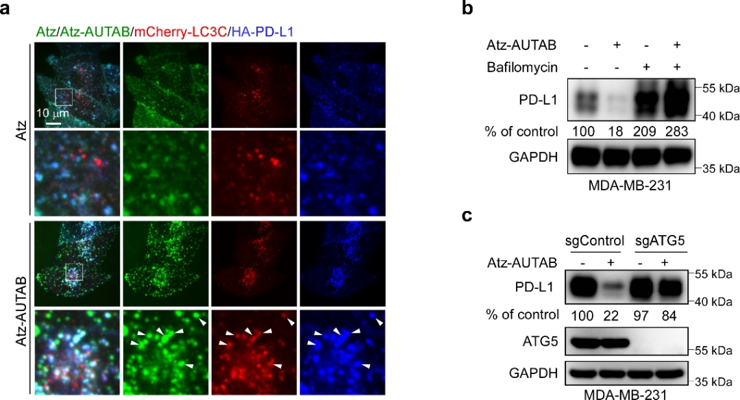 圖2. AUTAB技術(shù)的靶向蛋白自噬降解機(jī)制。(a) AUTAB誘導(dǎo)LC3C介導(dǎo)的自噬。(b) 溶酶體抑制劑Bafilomycin抑制AUTAB誘導(dǎo)的靶蛋白降解。(c) 敲除自噬關(guān)鍵蛋白ATG5抑制AUTAB誘導(dǎo)的靶蛋白降解。