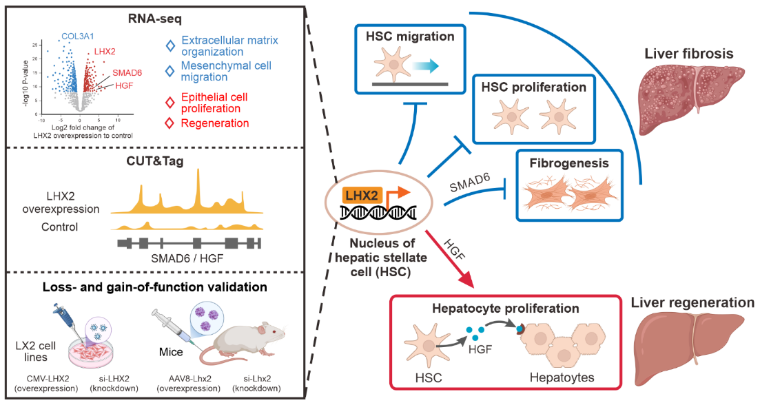 圖2?LHX2在肝纖維化和再生中調控作用的示意圖。通過轉錄組(RNA-seq)、蛋白結合的DNA位點檢測技術(CUT&Tag)以及敲降和過表達功能實驗,揭示了LHX2能夠抑制肝星狀細胞遷移、增殖和纖維生成,同時通過調控HGF的分泌促進肝細胞增殖。