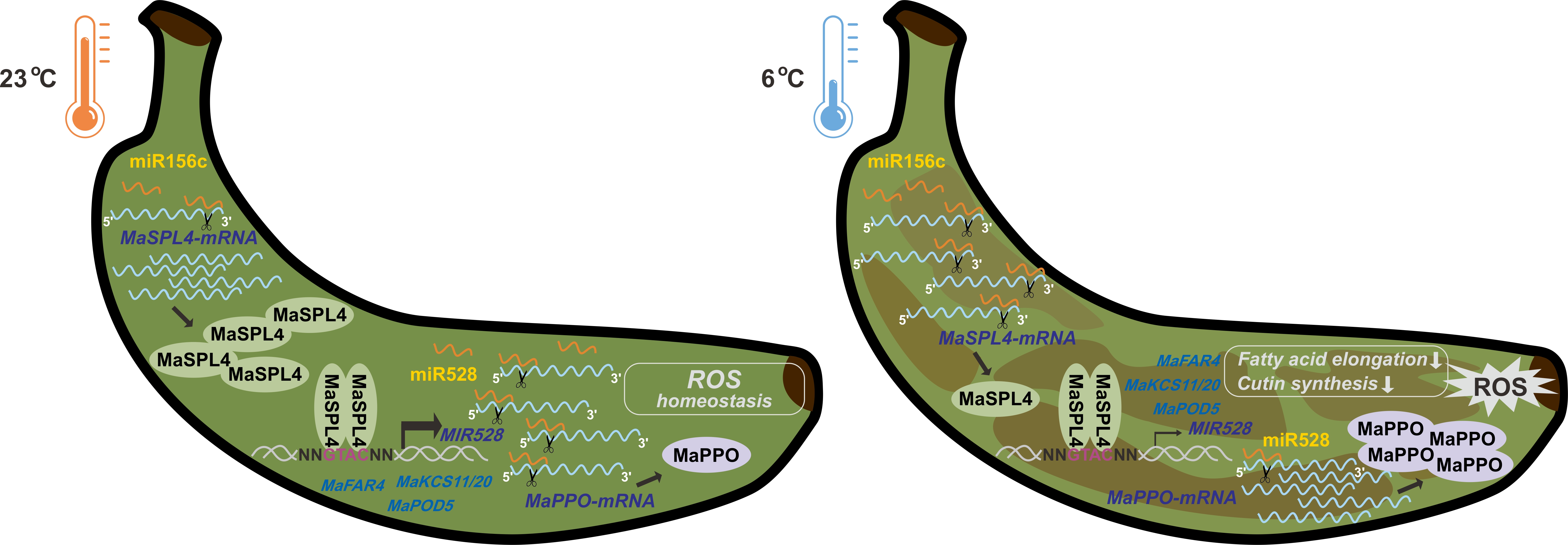 圖3. 參與香蕉冷脅迫響應的miR156c-SPL4-miR528-PPO級聯工作模型