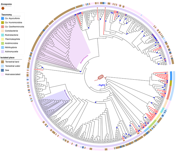 放線菌門的鞭毛進化分析顯示,盡管該細菌門中僅有13%的物種攜帶鞭毛基因,但這些基因可能源自共同祖先并通過垂直遺傳得以保留。研究表明,生活在水生環境中的單細胞放線菌更傾向具有鞭毛,而生活在土壤的絲狀放線菌或宿主相關環境中的病原菌或共生菌則往往缺乏鞭毛。這種鞭毛的大量獨立丟失現象可能與放線菌向陸生絲狀生長或宿主相關生活方式的轉變有關。放線菌鞭毛的退化性進化在具鞭毛物種的馬達組成上也有所體現。早期具有鞭毛的放線菌物種中存在完整的鞭毛桿成分,而在進化晚期則出現部分丟失,主要缺失鞭毛桿的遠端蛋白FlgFG。能形成游動孢子的放線菌物種例如Actinoplanes spp.具有極高的運動速度但沒有FlgFG,表明退化后的鞭毛依然具備運動功能。