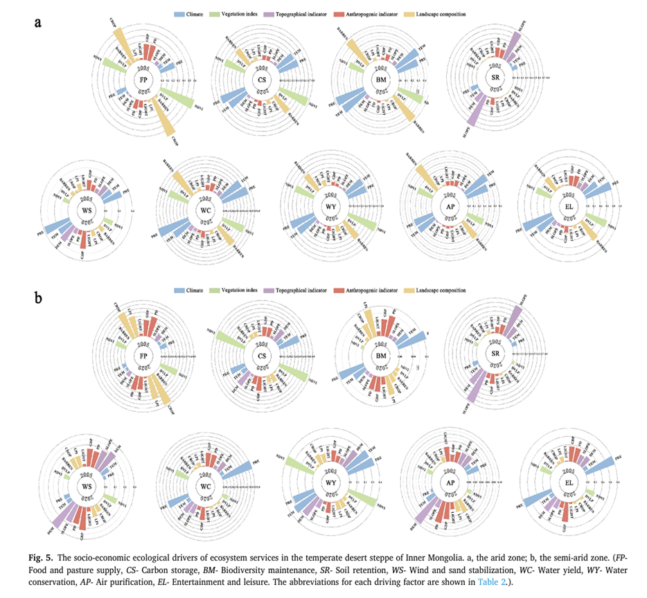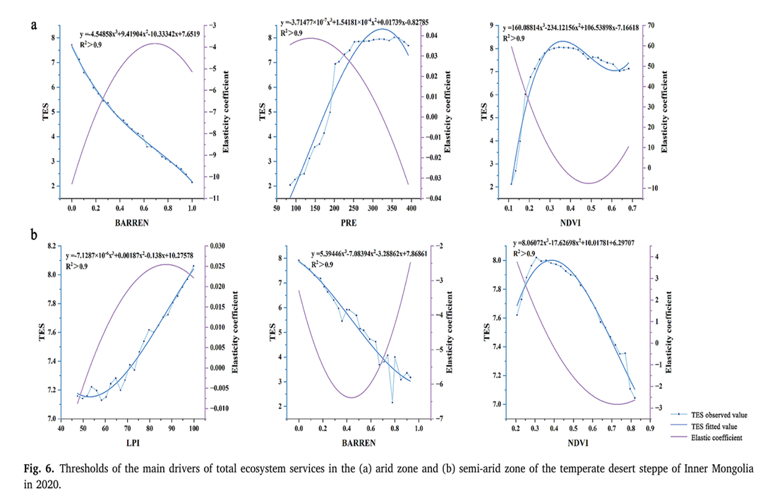 中國科學院華南植物園生態與環境科學研究中心劉紅曉副研究員等研究發現,沙漠草原的ESs分布呈現顯著的氣候差異,半干旱區的總ESs高于干旱區。然而,半干旱區ESs之間的權衡更加嚴重,且由于人為干擾,決定因素更加復雜和敏感。干旱區受自然因素影響,如荒地比例、氣溫、降水量和植被指數,而半干旱區則受景觀格局指數、人口密度和GDP的影響。主要影響因素存在明顯閾值,超過閾值后負面效應加強。干旱區,荒地比例閾值為69%、降水量138mm和NDVI為0.48。在半干旱區,荒地比例閾值為43%,NDVI為0.38,最大斑塊指數為87.4%。