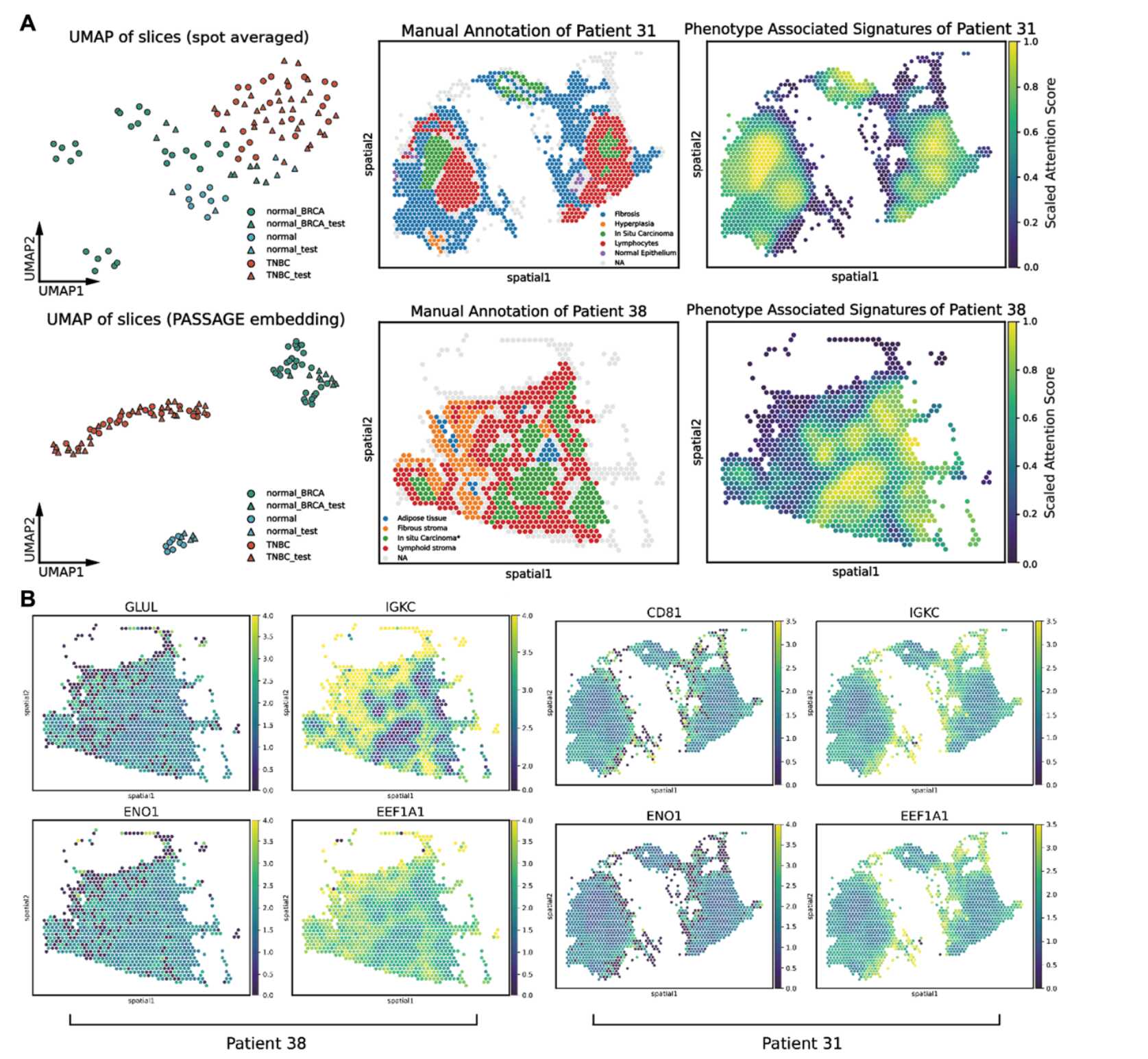 圖2 ?A)PASSAGE在乳腺癌案例中成功學(xué)習(xí)到良好的切片級(jí)表征與所識(shí)別的表型關(guān)聯(lián)空間特征?B)PASSAGE在乳腺癌案例中成功學(xué)習(xí)到與表型關(guān)聯(lián)空間特征高度關(guān)聯(lián)的基因集