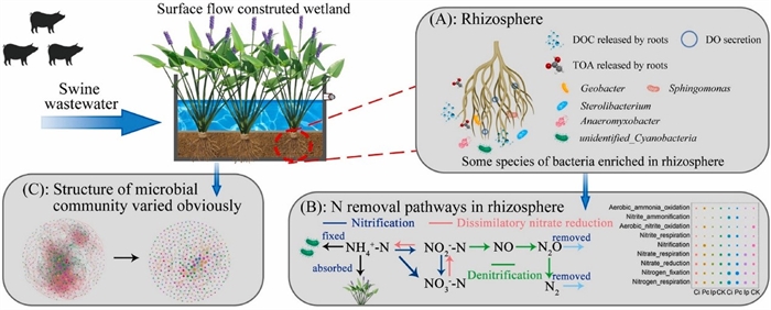 植物是人工濕地系統(tǒng)的重要組成部分之一,其根際是植物與微生物相互作用的主要區(qū)域。大約5%-21%的總光合固定碳以根系分泌物的形式轉(zhuǎn)移到根際,根系分泌物可以改變根際微生物的豐度和多樣性,進(jìn)而影響人工濕地中氮的去除效率。然而,處理高負(fù)荷污水過(guò)程中植物根系分泌物的變化特征及根際微生物群落的響應(yīng)機(jī)制仍不清楚。因此,中國(guó)科學(xué)院亞熱帶農(nóng)業(yè)生態(tài)研究所吳金水研究員團(tuán)隊(duì)通過(guò)野外小區(qū)控制試驗(yàn),選擇了美人蕉、梭魚(yú)草和黃菖蒲三種濕地植物對(duì)養(yǎng)殖廢水進(jìn)行處理。研究旨在揭示處理高負(fù)荷污水過(guò)程中濕地植物根際微生物群落的響應(yīng)特征及氮去除機(jī)制。