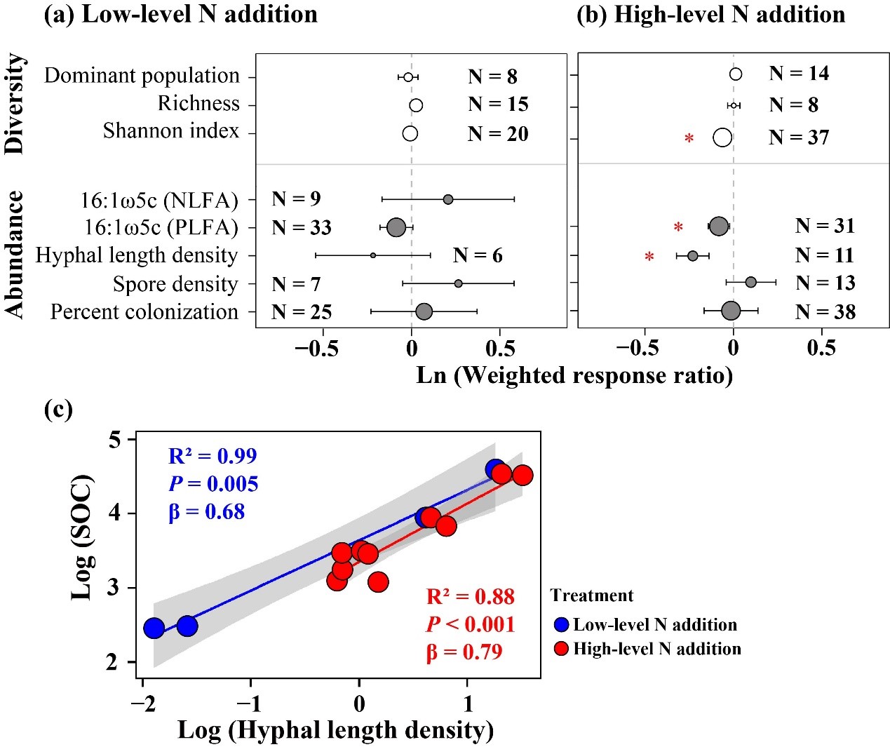 圖3.?低氮添加(a)和高氮添加(b)對熱帶森林AMF多樣性和豐度的影響,以及兩種氮添加水平下土壤AMF菌絲長度密度與土壤有機碳之間的關系?