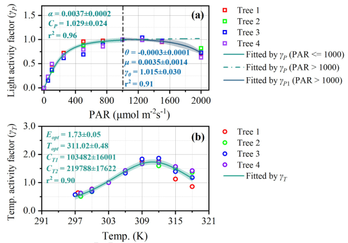 ?準確估算陸地植物排放的高活性萜烯化合物(單萜烯和倍半萜烯)排放量是探討其空氣質量和氣候效應的重要前提。溫度和光照是影響萜烯排放最重要的兩個環境因子,明確萜烯排放的光、溫響應機制對準確估算至關重要。自然條件下,溫度和光照的變化具有協同性,這可能導致前期基于動態箱及冠層通量法等非控制實驗結果不能解析光溫響應機制。