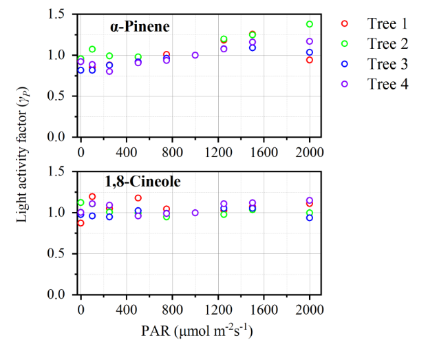 ?這些研究結果表明,在進行排放模型模擬時,β-羅勒烯等鏈狀單萜烯可以使用和異戊二烯一樣的光溫依賴算法;主要環狀單萜烯需要使用指數溫度依賴算法,但β值存在差異;而對于多數倍半萜烯則需要使用混合模型。