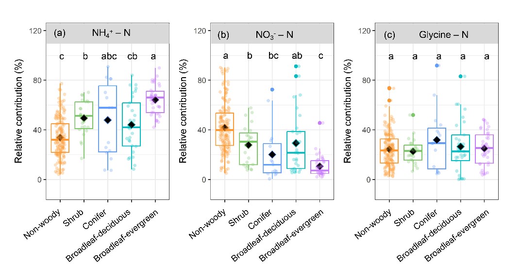 研究人員基于全球自然生態(tài)系統(tǒng)15N標(biāo)記實(shí)驗(yàn)數(shù)據(jù)庫,明晰了植物對土壤銨態(tài)氮,硝態(tài)氮以及有機(jī)氮(以甘氨酸為例)的相對吸收比例分別為41.6?±?1.1%,32.8?±?1.2%和25.6?±?0.9%。研究結(jié)果同時(shí)強(qiáng)調(diào)了植物氮素吸收偏好的緯度變化規(guī)律以及生物(植物類型)和非生物(氣候、土壤)驅(qū)動機(jī)理。銨態(tài)氮和硝態(tài)氮分別在(亞)熱帶地區(qū)和高緯度氣候區(qū)對植物氮吸收有更高的貢獻(xiàn)比例,植物對銨態(tài)氮的偏好模式主要受年平均溫度和土壤氮可利用性驅(qū)動;不同的是,硝態(tài)氮的偏好模式同時(shí)受到生物(植物類型)和非生物(氣候、土壤)因素驅(qū)動。該研究在全球尺度上揭示了自然生態(tài)系統(tǒng)植物氮素吸收偏好的變化規(guī)律和驅(qū)動因子,為深入理解全球變化背景下植物氮素獲取策略以及準(zhǔn)確評估氮獲取策略引起的碳固存變化提供了重要依據(jù)。