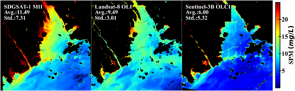 圖1. 使用SDGSAT-1 MII、Landsat-8 OLI和Sentinel-3B OLCI反演的珠江口懸浮泥沙濃度