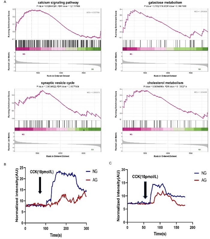 主要研究結(jié)果包括:1)作者首先通過比較反芻動物全消化道淀粉殘留情況,明確十二指腸是過瘤胃淀粉的主要消化部位(圖1A-B);通過比較生長和育肥階段反芻動物(羊和牛)與單胃動物(豬)的糞便淀粉殘留情況,明確反芻動物存在淀粉消化受限的現(xiàn)象(圖1C-D)。2)作者以山羊為試驗動物,首次繪制生成了新生山羊(非反芻模式)和斷奶山羊(反芻模式)胰腺單細胞圖譜,共鑒定到了包括胰腺外分泌腺泡細胞、導(dǎo)管細胞和內(nèi)分泌胰島細胞β,δ,ELC等在內(nèi)的11種細胞類型(圖2),并鑒定到了兩種腺泡細胞亞型,即高胰酶分泌特征的成熟型腺泡細胞亞型AC-s和低胰酶分泌特征的未成熟腺泡細胞亞型AC-i。胰酶(胰淀粉酶、蛋白酶和脂肪酶)、胞吐關(guān)鍵基因(IRF2,RAB27A,VAMP2,VAMP8,COPZ2,STX2,STX3)在成年山羊AC-s亞型表達增強。單細胞轉(zhuǎn)錄組和蛋白質(zhì)組聯(lián)合分析進一步表明反芻模式下的成年山羊的胰腺外分泌功能增強。值得注意的是,淀粉酶的活性在兩種消化模式下并未檢測到差異,說明胰腺α-淀粉酶活性較低可能是反芻動物淀粉水解的限制因素之一。3)胰腺單細胞細胞互作的結(jié)果顯示,與新生山羊相比,成年山羊預(yù)測到的腺泡與內(nèi)分泌細胞之間相互作用的數(shù)量減少;在成年山羊AC-ELC互作中發(fā)現(xiàn)了特有的配受體對JAG1-NOTCH1,此外,研究人員還發(fā)現(xiàn)JAG1和NOTCH1在AC-s中表達增強,與此同時胰島激素INS、PPY、GCG和SST表達降低,與之一致的是,成年山羊血清INS的含量顯著低于新生山羊。這些結(jié)果表明成年山羊AC-s中活化的NOTCH通路可能通過阻止腺泡細胞向內(nèi)分泌細胞β細胞轉(zhuǎn)化來維持“較強的胰腺外分泌功能”(圖3)。轉(zhuǎn)錄噪聲的結(jié)果顯示成年山羊內(nèi)分泌細胞轉(zhuǎn)錄噪聲表達增加伴隨著非典型激素表達增強;且成年山羊腺泡細胞轉(zhuǎn)錄噪聲表達降低伴隨著胰酶表達增強。結(jié)果暗示反芻動物消化模式轉(zhuǎn)變,可能通過轉(zhuǎn)錄噪聲調(diào)節(jié)“典型”酶和“非典型”激素的表達,產(chǎn)生增強外分泌功能、抑制內(nèi)分泌功能的生理基礎(chǔ)。4)單細胞轉(zhuǎn)錄組結(jié)果顯示反芻模式下成年山羊的腺泡細胞膜上關(guān)鍵調(diào)控受體CCKBR表達顯著降低。推測成年山羊腺泡細胞膜上CCKBR的低表達,加上十二指腸中Ⅰ型細胞的低分布,可能共同導(dǎo)致腸胰反射反應(yīng)緩慢,并誘導(dǎo)食物進入小腸和消化酶釋放的異步過程,最終限制淀粉消化(圖4)。5)之后作者開展胰腺細胞實驗,通過CCK(10 pmol/L)處理高CCKBR豐度新生山羊和低CCKBR豐度斷奶山羊腺泡細胞,測定腺泡細胞轉(zhuǎn)錄組特征、鈣離子振蕩反應(yīng)和胞吐反應(yīng)。結(jié)果顯示鈣離子信號通路和胞吐信號通路在低CCKBR豐度成年山羊均要弱于高CCKBR豐度新生山羊(圖5),證明了成年山羊腺泡細胞CCKBR低表達抑制淀粉酶分泌。