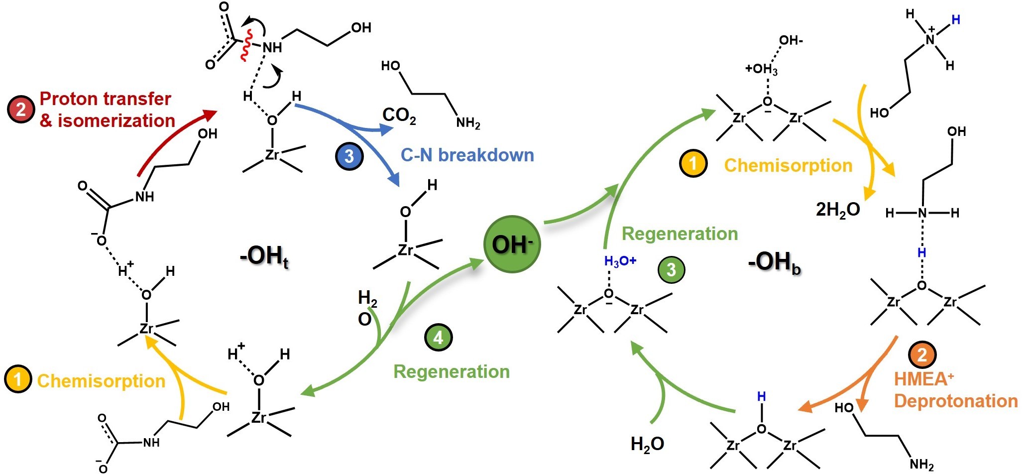 針對上述問題和基于前期研究基礎(chǔ)(ACS Catalysis,2022,12,11485-11493),該工作通過調(diào)控溶膠-凝膠合成方法的pH值,獲得了富含橋聯(lián)羥基(-OHb)和端位羥基(-OHt)的ZrOxHy固體催化劑。原位表征和動力學(xué)研究表明無需這兩種羥基在催化劑表面的空間鄰近性,通過催化劑羥基之間的酸(-OHb)堿(-OHt)平衡和協(xié)同催化即可實現(xiàn)氨基甲酸鹽解離與質(zhì)子轉(zhuǎn)移的雙循環(huán)反應(yīng),從而提升CO2的脫附速率。在固定床實驗中,ZrOxHy催化劑表現(xiàn)出優(yōu)異的催化性能,在95℃條件下CO2從胺溶液中的脫附速率提升2.5倍,顯著降低了溶劑再生能耗和再生溫度。該催化劑也具有良好的循環(huán)穩(wěn)定性和可回收性。