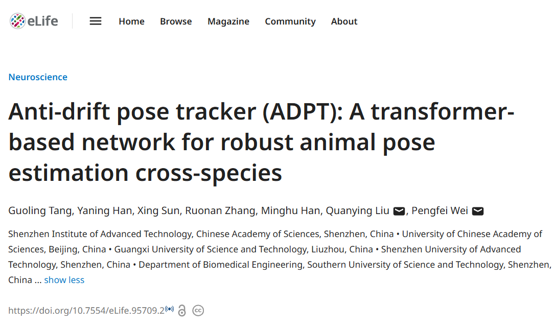近日,中國科學(xué)院深圳先進技術(shù)研究院(簡稱“深圳先進院”)腦認(rèn)知與腦疾病研究所/深港腦科學(xué)創(chuàng)新研究院蔚鵬飛研究員團隊在國際學(xué)術(shù)期刊eLife發(fā)表了題為“Anti-drift pose tracker (ADPT):A transformer-based network for robust animal pose estimation across species”的研究論文。研究團隊提出了一種基于Transformer架構(gòu)的抗漂移姿態(tài)追蹤技術(shù)(ADPT),成功實現(xiàn)跨物種動物姿態(tài)追蹤的高精度、高魯棒性檢測。