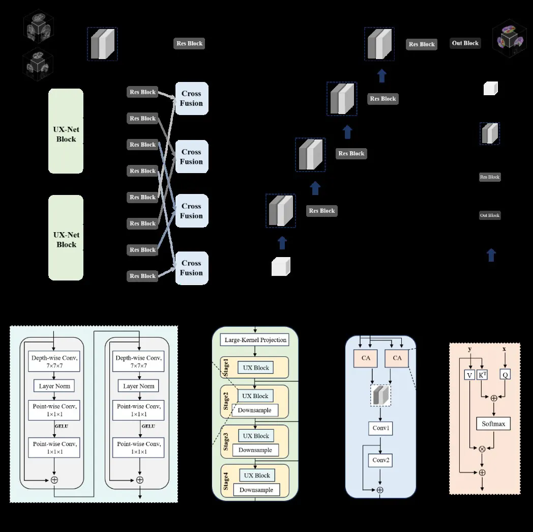 研究團隊提出了一種基于交叉融合機制的全腦區(qū)自動分割方法,通過融合功能和結(jié)構(gòu)信息以提高腦區(qū)分割的準確性。該網(wǎng)絡(luò)同時處理PET和MR圖像,在編碼部分,首先采用UX-Net進行特征提取,然后利用基于交叉注意力機制的融合模塊進行結(jié)構(gòu)和功能特征融合,以增強分割網(wǎng)絡(luò)對多模態(tài)信息的適應(yīng)性,提高分割效果。