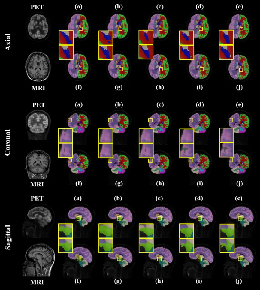 腦區(qū)分割是醫(yī)學圖像處理的主要任務(wù),對神經(jīng)科學研究和臨床診斷都有著深遠的影響。精確的腦區(qū)分割對于分析不同的腦區(qū)至關(guān)重要,因為它們的體積、表面積和形態(tài)與各種神經(jīng)系統(tǒng)疾病有關(guān),比如帕金森病和阿爾茨海默病等。PET/MR成像系統(tǒng)則是一種有效的腦部疾病診斷工具,它結(jié)合了PET代謝成像和MR結(jié)構(gòu)成像的優(yōu)點,可以在疾病早期觀察到特定大腦區(qū)域的代謝異常和結(jié)構(gòu)變化,從而將功能和代謝雙模態(tài)信息相結(jié)合用于腦疾病診斷。