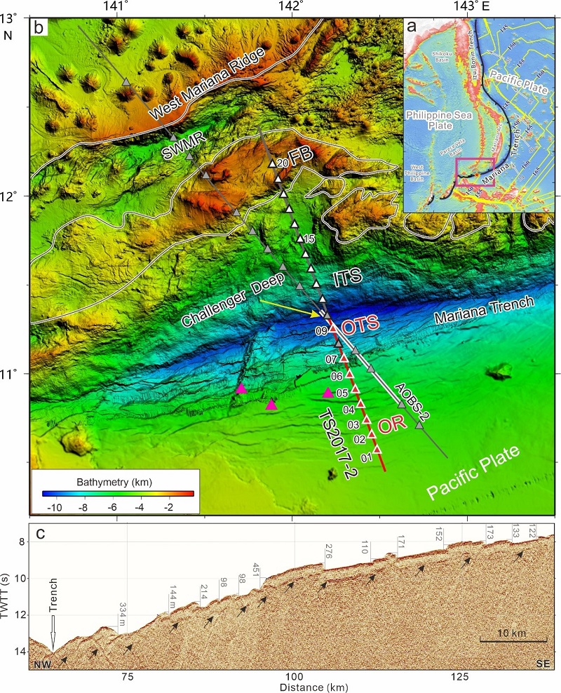 近日,中國科學院南海海洋研究所邊緣海與大洋地質重點實驗室(OMG)丘學林研究團隊,聯合中國科學院地質與地球物理研究所、中國科學院深海科學與工程研究所和德國GEOMAR-亥姆霍茲基爾海洋研究中心,利用萬米級人工源地震剖面,成功獲得了馬里亞納“挑戰者深淵”俯沖板塊上地幔頂部高度蛇紋石化層的橫波速度和縱橫波速比。該成果發表已發表在國際地學期刊《地球物理研究通訊》(Geophysical Research Letters)上,副研究員賀恩遠為論文第一作者,研究員丘學林為通訊作者。