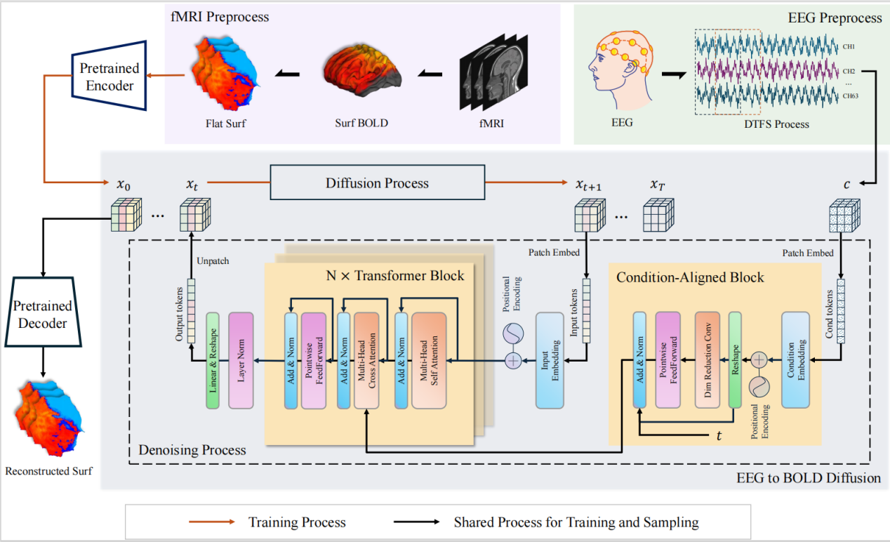 為突破這一瓶頸,中國科學院深圳先進技術研究院王書強課題組提出了一種創新的解決方案-通過構建條件對齊時序擴散模型(CATD),實現腦電-腦血氧信號的統一表征。團隊相關工作近日在IEEE Transactions on Medical Imaging發表了題為CATD: Unified Representation Learning for EEG-to-fMRI Cross-Modal Generation的研究成果,首次實現了基于擴散學習的EEG到fMRI跨模態表征,將BOLD信號時間分辨率提升3倍,為便捷獲取高質量腦功能信號提供新方案。