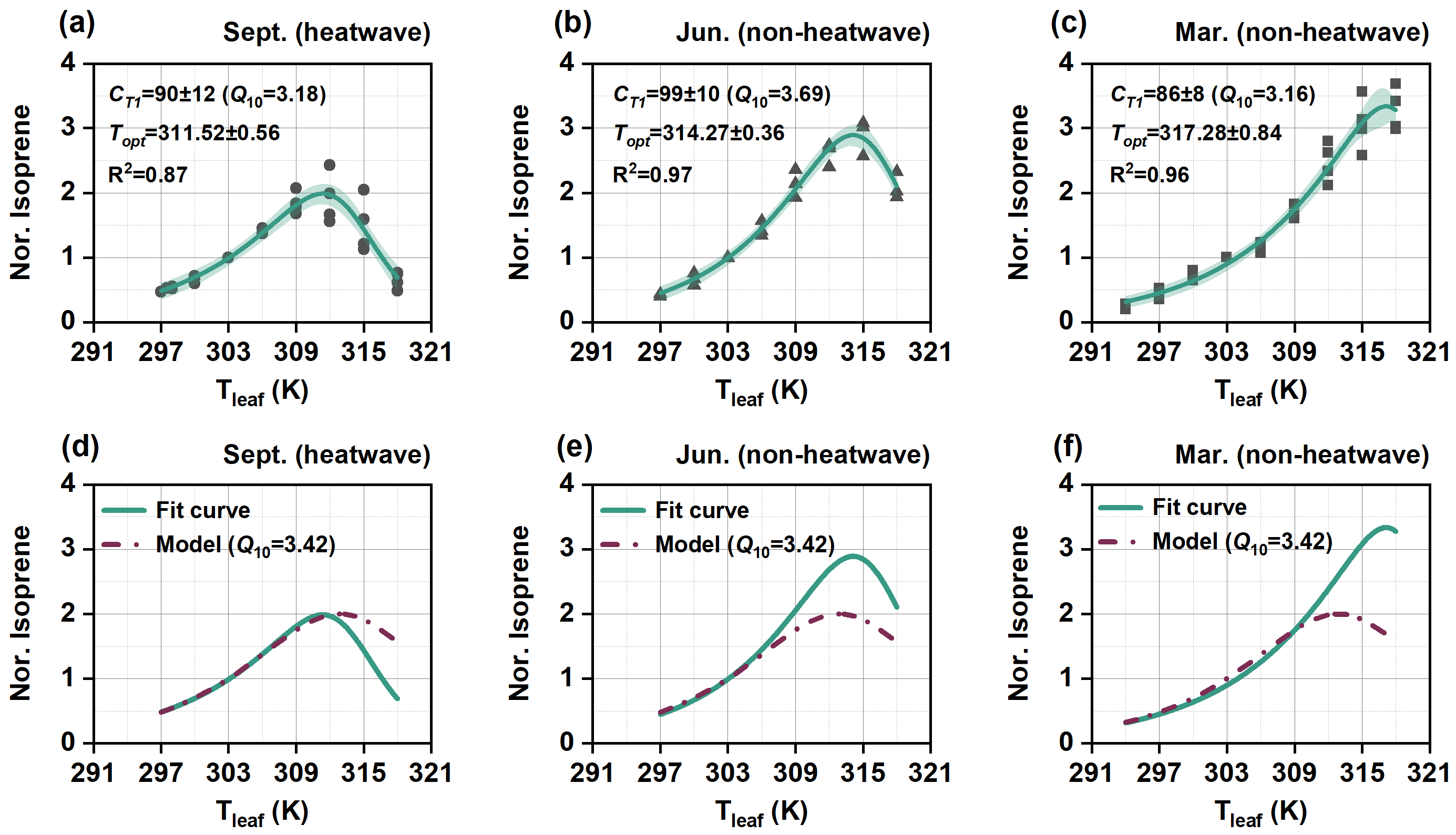 圖1. 濕季熱浪期(September,a)、濕季非熱浪期(June,b)和干季非熱浪期(March,c)的異戊二烯溫度響應曲線,及其和默認模型溫度曲線(Topt = 313 K)的對比(d,e,f)