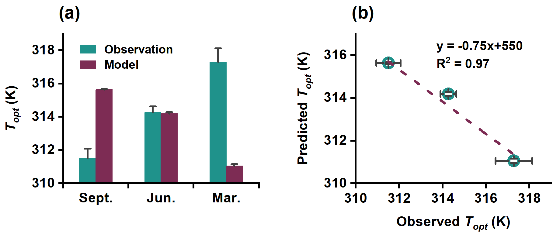 圖2. 模型考慮溫度適應機制預測的Topt和觀測結果對比