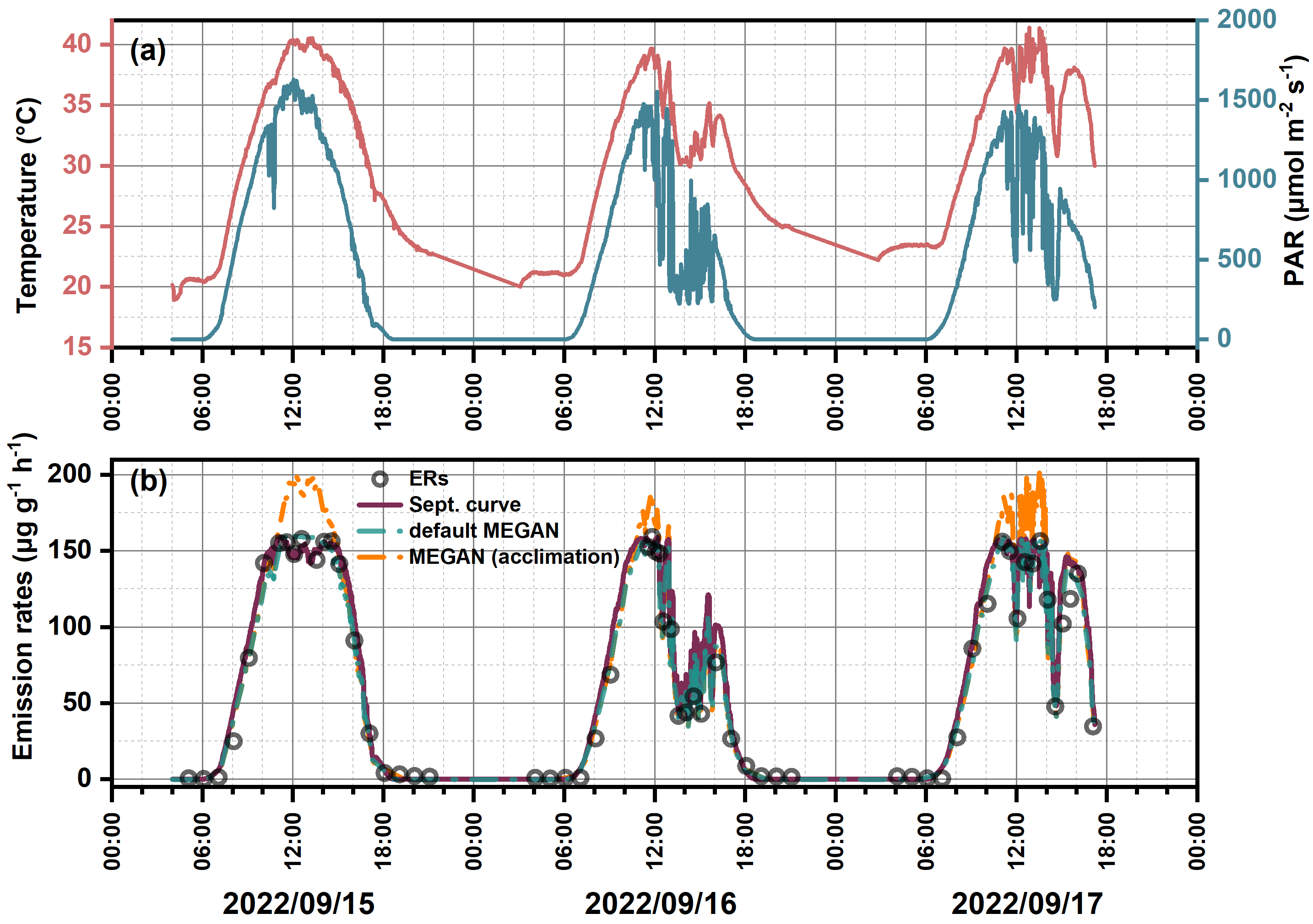 圖3. 極端熱浪期間溫度和光照的時間序列(a),及模擬的排放速率(線)和觀測結果(點)對比(b)。紫色線為九月的實測溫度曲線模擬結果;綠色為默認模型(不考慮溫度適應機制)模擬結果;黃色為考慮溫度適應機制的模擬結果
