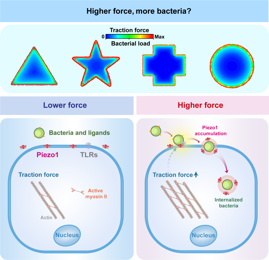 在此基礎上,研究團隊“鎖定”了關鍵蛋白--力敏感性離子通道蛋白 Piezo1的作用:當細菌開始入侵時,這種能感知牽引力的蛋白會像磁鐵一樣聚集到感染部位,形成特殊的囊泡結構。這些囊泡就像“信號放大器”,把細胞受到的牽引力轉化為“生化信號”,促使更多細菌在邊緣區域聚集感染。