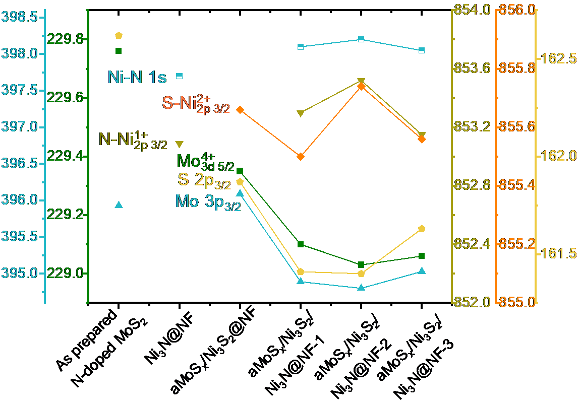 針對(duì)上述問(wèn)題,廣州能源所制氫與利用科研團(tuán)隊(duì)提出“結(jié)構(gòu)-界面同步優(yōu)化”策略,構(gòu)建了三相異質(zhì)結(jié)催化劑a-MoS?/Ni3S2/Ni3N@NF-2。通過(guò)調(diào)控前驅(qū)體比例實(shí)現(xiàn)組分/形貌可控合成,建立三維導(dǎo)電網(wǎng)絡(luò)和超親水疏氣表面,顯著提升活性位點(diǎn)暴露率與氣泡脫附速率(圖1)。研究表明:Ni3S2可調(diào)控中間體吸附能,其比例調(diào)控可誘導(dǎo)強(qiáng)界面電子相互作用。XPS與DFT計(jì)算證實(shí)(圖2),Mo位點(diǎn)電子密度提升使氫吸附自由能(ΔGH*)降低至-0.06 eV,接近鉑基催化劑理論值。