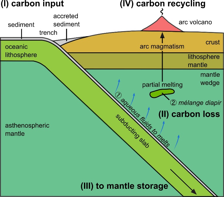 圖1. 以深部碳循環(huán)為視角的俯沖帶示意圖。碳通過(guò)多種途徑參與深部循環(huán):(I)沉積巖和大洋巖石圈(即地殼和巖石圈地幔)巖石向俯沖帶輸入碳。(II)在俯沖過(guò)程中,碳通過(guò)脫揮發(fā)分作用、溶解及部分熔融等方式從俯沖板塊中釋放。(III)部分碳被進(jìn)一步帶入地幔深處并儲(chǔ)存;(IV)一部分碳通過(guò)弧火山作用重新返回地表。需要注意的是,俯沖板片中碳的釋放可以用兩種端元模式來(lái)解釋。①傳統(tǒng)模式:認(rèn)為俯沖板塊釋放的流體和熔體導(dǎo)致地幔楔發(fā)生部分熔融,從而產(chǎn)生弧巖漿;②混雜巖(mélange)模式:認(rèn)為俯沖板塊的沉積物、蝕變洋殼和水化的地幔物理混合形成的混合巖,以底辟(diapirs)的形式上升到地幔楔,熔化后產(chǎn)生弧巖漿。