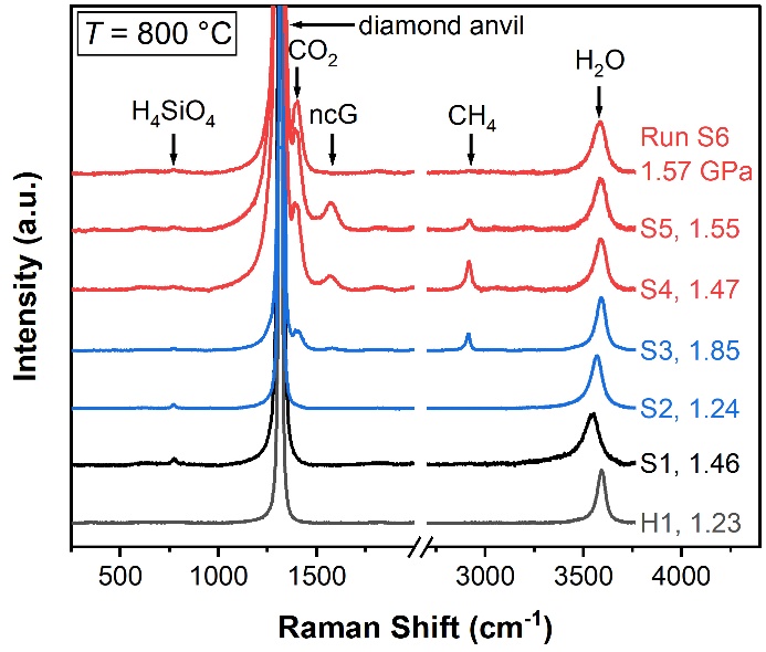圖2. 比較純H2O(H1實(shí)驗(yàn))、SiO2-H2O(S1實(shí)驗(yàn))和SiO2-COH(S2-6實(shí)驗(yàn))體系在800 ℃和約1.5 GPa下超過(guò)一小時(shí)的含水流體拉曼光譜。請(qǐng)注意,光譜的基線已校正,強(qiáng)度已根據(jù)近3600 cm-1處的H2O峰高進(jìn)行了歸一化處理。