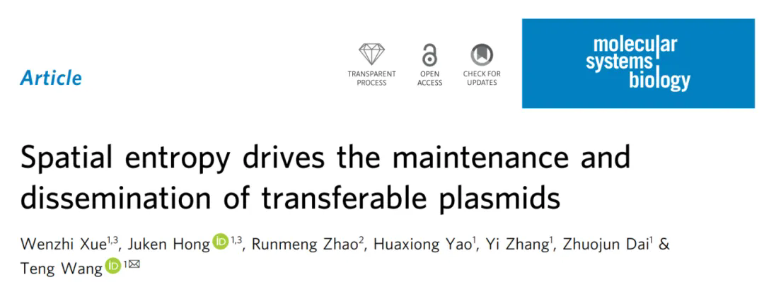 5月1日,王騰研究員課題組在Molecular Systems Biology上發表了題為"Spatial entropy drives the maintenance?and dissemination of transferable plasmids"的研究論文。該工作首次將物理學中“熵”的概念引入微生物生態學,揭示了空間結構驅動基因水平轉移的普適機制。