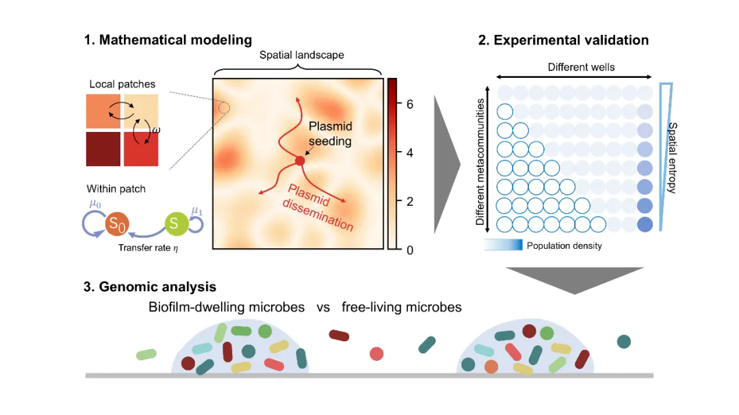 本研究首次將物理學“熵”概念引入微生物生態學,揭示了空間結構驅動基因水平轉移的普適機制,挑戰了均勻環境假設下的經典理論,為耐藥性傳播預測提供了新思路,推動生態學與進化理論的整合。實際應用中,提出通過調控環境熵(如破壞生物膜、減少微塑料污染)抑制ARGs擴散的策略,為公共衛生管理及微生物組工程提供了關鍵理論工具,為抗生素抗性管理提供新靶點(如干預生物膜形成)。此外,跨學科整合模型構建-實驗-大數據的方法,為解析復雜生態系統中的進化動力學樹立了范例。