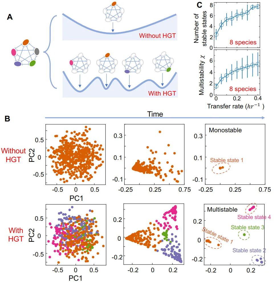 微生物群落在相同環境中常呈現不同的穩定狀態,但其多穩態的起源機制尚不明確。以往研究聚焦于物種互作和資源競爭,而水平基因轉移(HGT)作為微生物進化的重要驅動力,其作用長期被忽視。HGT通過可移動遺傳元件(MGEs)改變宿主生長速率和種間相互作用,可能重塑群落穩定性,然而HGT如何影響多穩態的形成仍缺乏系統性研究。理解這一機制對揭示微生物群落動態及調控具有重要意義。