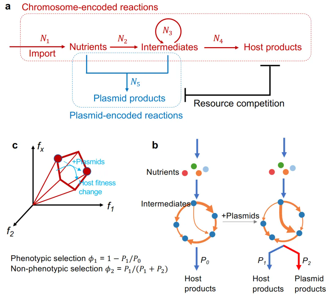 質粒作為原核生物中廣泛存在的可移動遺傳元件,在微生物進化、抗生素抗性傳播及病原毒力擴散中扮演核心角色。依據傳統達爾文進化理論,質粒的存續依賴于宿主表型選擇(如宿主生長負擔的降低),但近年研究發現,非表型選擇(如質粒自身復制效率、水平轉移能力)同樣顯著影響其穩定性。例如,人類腸道中廣泛存在的pBI143質粒雖無明確功能基因且面臨強選擇壓力,挑戰了傳統表型選擇范式。然而,現有研究多聚焦單一選擇壓力,對兩種力量如何共同塑造染色體/質粒平衡缺乏系統性定量模型,尤其缺乏對代謝資源分配、宿主基因組規模等內在因素的動態解析。這一理論空白限制了對質粒多樣性的進化解釋,也阻礙了臨床耐藥基因傳播的精準干預。