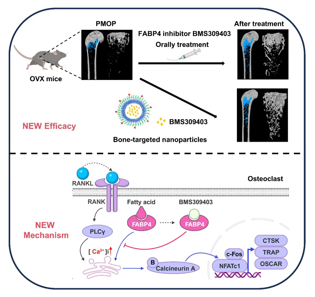 本研究顯示,臨床PMOP患者血清中FABP4水平顯著升高,且與骨密度呈負相關關系。此外,在卵巢切除小鼠模型中,FABP4在血清及骨髓腔內均高表達。體外實驗進一步證實,FABP4蛋白對BMSC的成骨分化無顯著影響,但能顯著促進破骨前體細胞的分化與成熟。藥效學研究表明,FABP4抑制劑BMS309403對破骨細胞分化的IC50為0.89 μM,與常用臨床藥物阿侖膦酸鈉(IC50 = 0.44 μM)接近。機制上,FABP4可通過激活Ca2+-Calcineurin-NFATc1信號通路,促進破骨細胞分化。在卵巢切除小鼠中,口服BMS309403可顯著抑制長骨和腰椎松質骨的骨質流失,并有效改善長骨的彈性模量和剛性。進一步通過骨靶向納米粒子遞送BMS309403治療后,其抗骨質疏松效果與阿侖膦酸鈉相當甚至更優,顯示了良好的應用前景。
