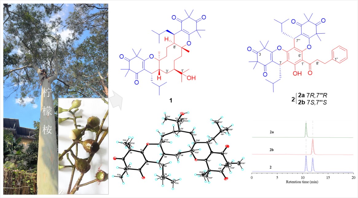 相關研究成果以“Corymbinols A and B: Bis-β-triketone Conjugates of Sesquiterpene and Chalcone from the Fruit of?Corymbia citriodora”為題發表于國際權威期刊Organic Letters(《有機化學通訊》)。中國科學院華南植物園李玉林博士后、中國科學院昆明植物研究所丁驍副研究員和段先樂碩士研究生為本文的共同第一作者。華南植物園邱聲祥研究員和中國科學院昆明植物研究所郝小江研究員為本文的共同通訊作者。該工作得到了國家自然科學基金和中國科學院科技服務網絡計劃的資助。文章鏈接:https://doi.org/10.1021/acs.orglett.5c01245