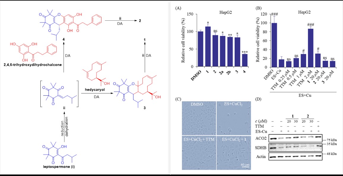 檸檬桉(C. citriodora)是桃金娘科傘房桉屬的一種高大喬木,其枝葉和樹脂已被廣泛用于提取具有抗菌和抗炎活性的成分。然而,長期以來,檸檬桉的果實并未受到化學研究的充分關注。本研究團隊通過核磁共振(NMR)、電子圓二色光譜(ECD)及X射線單晶衍射技術,成功解析了corymbinols?A和B的復雜結構。其中,corymbinol A具有前所未有的6/6/10/6/6五環骨架,該骨架由倍半萜單元(C15)與雙β-三酮通過連續兩步雜Diels–Alder(HDA)環加成形成;corymbinol B為一對對映異構的雙β-三酮-二氫查耳酮雜合物。銅與線粒體三羧酸循環中的酯化酶結合而導致蛋白質毒性應激,并最終導致細胞銅死亡。本研究通過銅離子載體elesclomol與Cu2+聯用構建銅死亡誘導模型,旨在發現非銅螯合劑的銅死亡抑制劑。實驗表明,corymbinol A在20?μM濃度下可部分逆轉由于Cu2+過度積累導致的肝母細胞瘤HepG2細胞的銅死亡。同時corymbinol A部分回復了銅死亡相關線粒體鐵硫簇蛋白ACO2和SDHB的表達水平。研究團隊還提出了其生物合成路徑:桃金娘科植物中廣泛存在的β-三酮單體(leptospermone)經還原、脫水生成關鍵中間體ii,該中間體分別與hedycaryol和2,4,6-三羥基二氫查爾酮發生HDA環加成反應,從而形成了化合物corymbinol?C(3)和4,化合物3和4進一步與中間體ii發生HDA反應,最終分別生成corymbinols?A(1)和B(2)(圖2)。該研究不僅拓展了多環多甲基間苯三酚類化合物的化學多樣性,還為靶向銅死亡的藥物研發提供了全新的分子骨架。