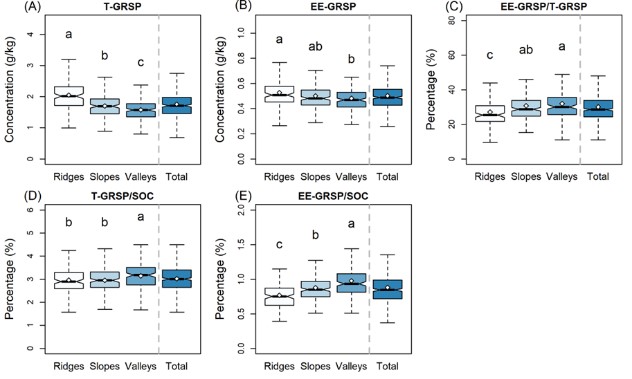 圖1. 尖峰嶺熱帶山地雨林三類地形中球囊霉素相關蛋白分布特征對比。注:T-GRSP,總球囊霉素相關蛋白;EE-GRSP,易提取球囊霉素相關蛋白;SOC,土壤有機碳。