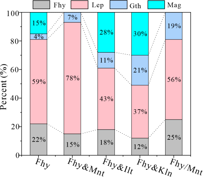 ?針對上述問題,中國科學院廣州地球化學研究所礦物學團隊系統研究了黏土礦物在還原條件下對Fe(II)催化水鐵礦相轉化過程的制約,重點考察了黏土礦物種類(蒙脫石Mnt、伊利石Ilt、高嶺石Kln)及黏土礦物和水鐵礦(Fhy)的復合方式(二者物理混合(Fhy&clay)、在黏土礦物表面原位生長水鐵礦(Fhy/clay))的影響,主要得到以下認識: