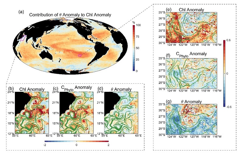 該研究從全球尺度上揭示了亞中尺度過程影響浮游植物分布特征與機制的顯著區域差異性,指出亞中尺度過程引起的葉綠素濃度升高不一定來源于生物量的增加,也可能是生理學狀態調整的結果。研究成果為深入理解亞中尺度動力過程的生態效應提供了新的見解,對準確評估亞中尺度過程對海洋初級生產力和碳循環關鍵過程的影響有重要科學意義。