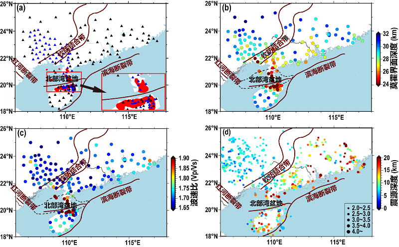 研究結果顯示,北部灣盆地區(qū)域的地殼厚度普遍小于26 km,平均波速比(Vp/Vs)高于1.80,LAB埋深較淺且界面處存在明顯的波速突變。此外,該區(qū)域地震活動表現(xiàn)出震源深度增大的特征。這些特征表明,北部灣區(qū)域的巖石圈結構經(jīng)歷了顯著的改造過程,推測地幔上涌可能是主要的動力學機制。在此過程中,地幔物質向上運移并導致部分熔體在巖石圈底部堆積,一方面通過巖漿作用改變了地殼結構和物質組成,形成晚新生代玄武巖;另一方面,這種深部過程還可能通過改變區(qū)域應力狀態(tài)而影響地震孕震機制,導致震源深度增加。該研究為深入理解板內巖石圈變形及殼幔相互作用機制提供了重要的科學依據(jù)。