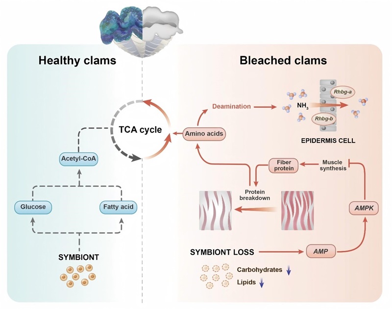 全球海洋持續變暖是珊瑚礁生態系統的首要威脅,同珊瑚一樣,依賴光合共生的硨磲也難以幸免于白化危機。研究團隊以番紅硨磲(Tridacna crocea)為模型,模擬未來海洋升溫場景,成功誘導了硨磲白化現象。通過整合組織生理學與多維組學分析,系統闡明了硨磲在應對白化的獨特“能量補償”策略:面對由于白化-共生藻“斷供”導致的能量枯竭,硨磲激活了體內的"能量感應開關"(AMPK通路),減少能量消耗;并啟動"肌肉降解信號"(FoxO-atrogin通路),驅動共生組織中的"肌肉萎縮"和蛋白降解,為氨基酸代謝提供了原料。這種碳水化合物/脂肪酸到氨基酸的代謝轉變,以及膠原蛋白豐富的肌肉纖維的降解和重塑是其存活的關鍵(圖2)。此外,研究還發現,部分硨磲在經歷了白化后仍具有膠原性肌纖維的再生能力,表現出較強的生理韌性。研究成果不但揭示了珊瑚礁生物獨特的白化適應性,也為珊瑚礁生態系統的保護和修復提供了科學依據。