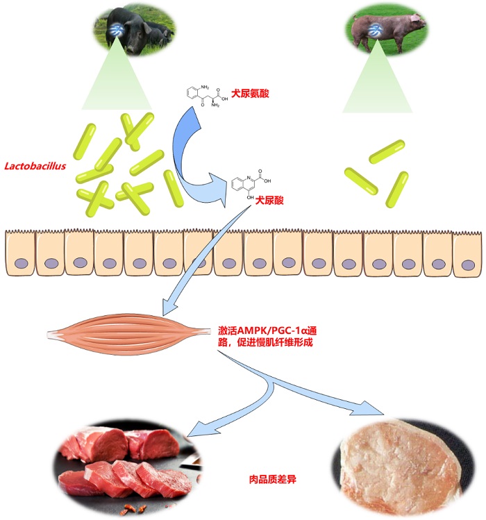 研究結果表明:1)桃源黑豬和湘村黑豬的慢肌纖維比例顯著高于杜洛克豬,肌纖維橫截面積更小,系水力和肌內脂肪含量更高,但胴體重較低。2)肌肉靶向代謝組檢測發現了24種差異代謝物,其中β-丙氨酸和蘋果酸含量與肌肉系水力呈顯著正相關。3)地方品種豬肌肉中脂質分解相關基因(HSL、ATGL和CPT1)和糖酵解相關基因(LDH和PFKFB3)的表達較低,是其肌內脂肪含量較高而糖酵解潛力較低的原因。4)地方品種豬結腸中乳桿菌(Lactobacillus)的豐度較高,并可通過色氨酸代謝途徑促進犬尿酸的合成;犬尿酸可激活肌肉AMPK/PGC-1α信號通路,上調肌肉中慢肌纖維的比例。5)FMT實驗證實,移植地方品種豬腸道菌群的小鼠,機體犬尿酸水平和肌肉AMPK表達水平提高,其慢肌纖維比例呈上升趨勢。