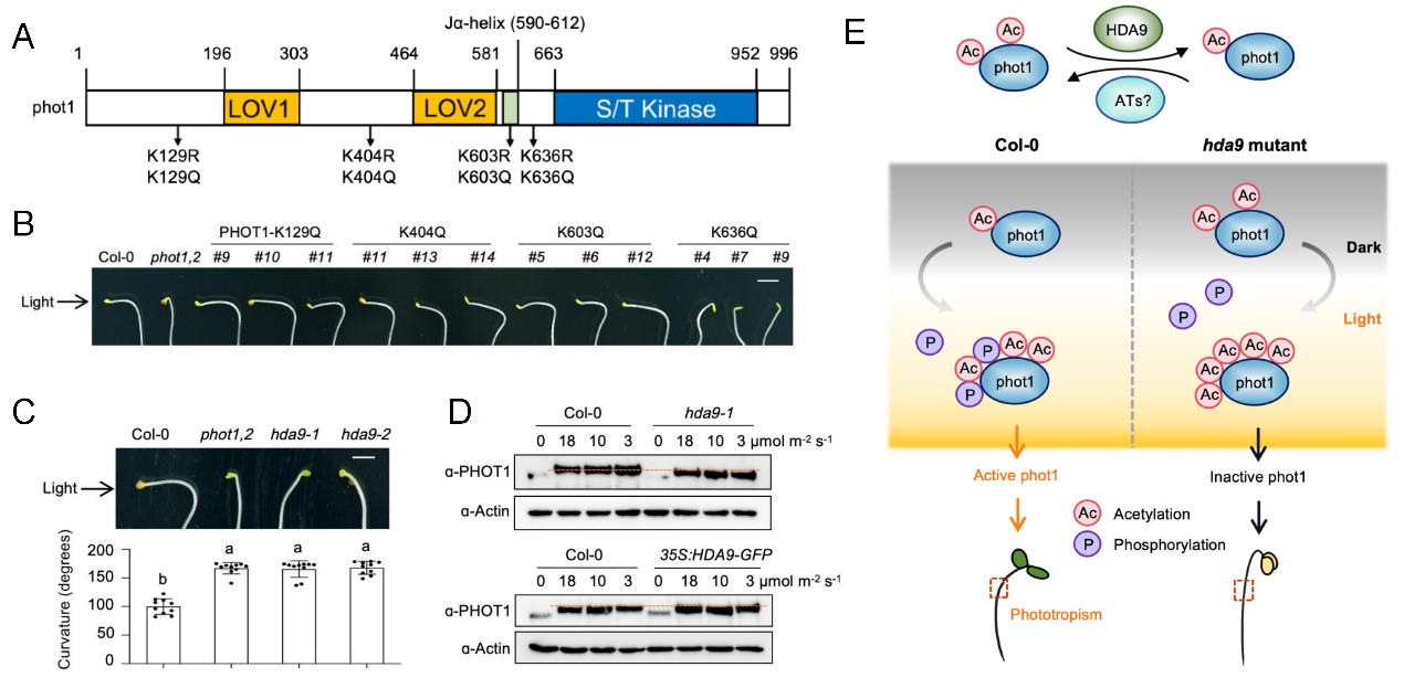 中國科學院華南植物園劉勛成研究團隊鑒定發現phot1的多個賴氨酸位點發生乙酰化修飾,并證實保守的賴氨酸位點(K636)的乙酰化修飾調控其自磷酸化和激酶活性,影響植物的向光性反應;遺傳表型篩選發現賴氨酸去乙酰化酶HDA9為調控植物向光性和phot1活性的關鍵上游因子,通過調節phot1的乙酰化水平影響其磷酸化與激酶活性;同時,證實該"乙酰化-磷酸化協同調控"作用在不同物種如番茄、煙草和花生中具有高度的保守性,凸顯該機制在植物向光性信號轉導途徑中的廣泛性與重要性。