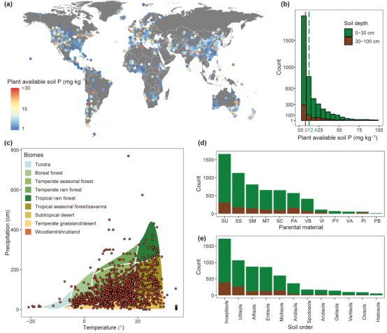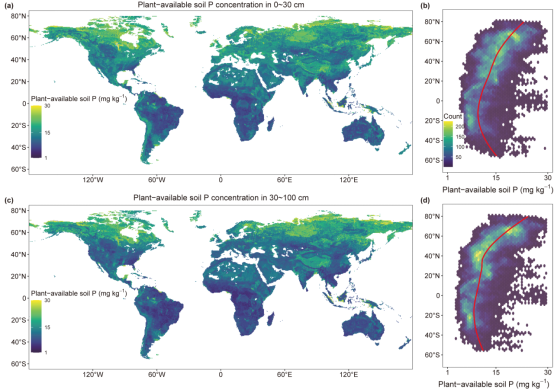磷(P)通常是陸地生態(tài)系統(tǒng)中限制植物生產(chǎn)力的關(guān)鍵養(yǎng)分,在許多自然和半自然生態(tài)系統(tǒng)中,其可利用性直接決定著植物群落的結(jié)構(gòu)、初級(jí)生產(chǎn)力以及養(yǎng)分利用效率。土壤是植物獲取磷的主要來(lái)源,而植物可利用磷是土壤總磷中能被植物根系直接吸收的那一小部分,尤其對(duì)缺乏分泌羧化物以溶解難溶磷的植物來(lái)說(shuō),這部分有效磷更為關(guān)鍵。由于磷在土壤中遷移性差、再生緩慢,且易受pH值、有機(jī)質(zhì)含量、礦物組成和水文條件等多種環(huán)境因子的影響,土壤有效磷的時(shí)空異質(zhì)性極強(qiáng)。因此,明確其含量、儲(chǔ)量、空間分布及環(huán)境驅(qū)動(dòng)機(jī)制,不僅是深入理解陸地生態(tài)系統(tǒng)磷循環(huán)與植物養(yǎng)分限制的基礎(chǔ),也對(duì)于預(yù)測(cè)全球變化背景下養(yǎng)分格局變化、生態(tài)系統(tǒng)功能穩(wěn)定性及碳-養(yǎng)分耦合關(guān)系具有重要意義。特別是在全球氣候變化和人類(lèi)活動(dòng)不斷加劇的背景下,建立全球尺度的土壤有效磷數(shù)據(jù)集和分析框架,對(duì)于改進(jìn)陸地生態(tài)系統(tǒng)模型和提升全球生物地球化學(xué)循環(huán)預(yù)測(cè)能力具有重要應(yīng)用價(jià)值。