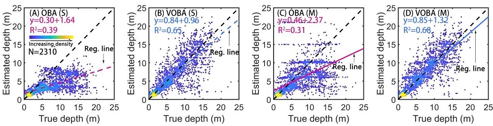 圖 1?以全球12個區域的Landsat-5/7數據為例,增加虛擬近岸波段前(OBA)后(VOBA)的水深反演值和實測值的散點密度圖。其中S和M分別表示表示單個和多個水深初始值的反演策略。(詳細請查看原文Liu et al. 2025,GISci. Remote Sens.)