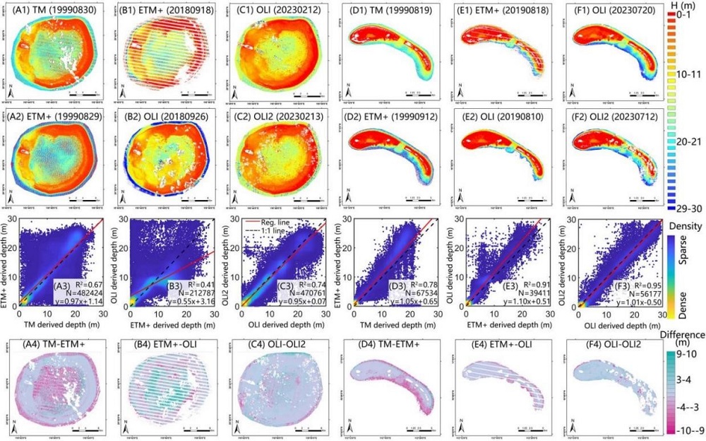 圖 2?以東沙島和七連嶼為例,評估Landsat-5/7/8/9水深反演值的一致性。(詳細請查看原文Liu et al. 2025,Int. J. Appl. Earth Obs.)