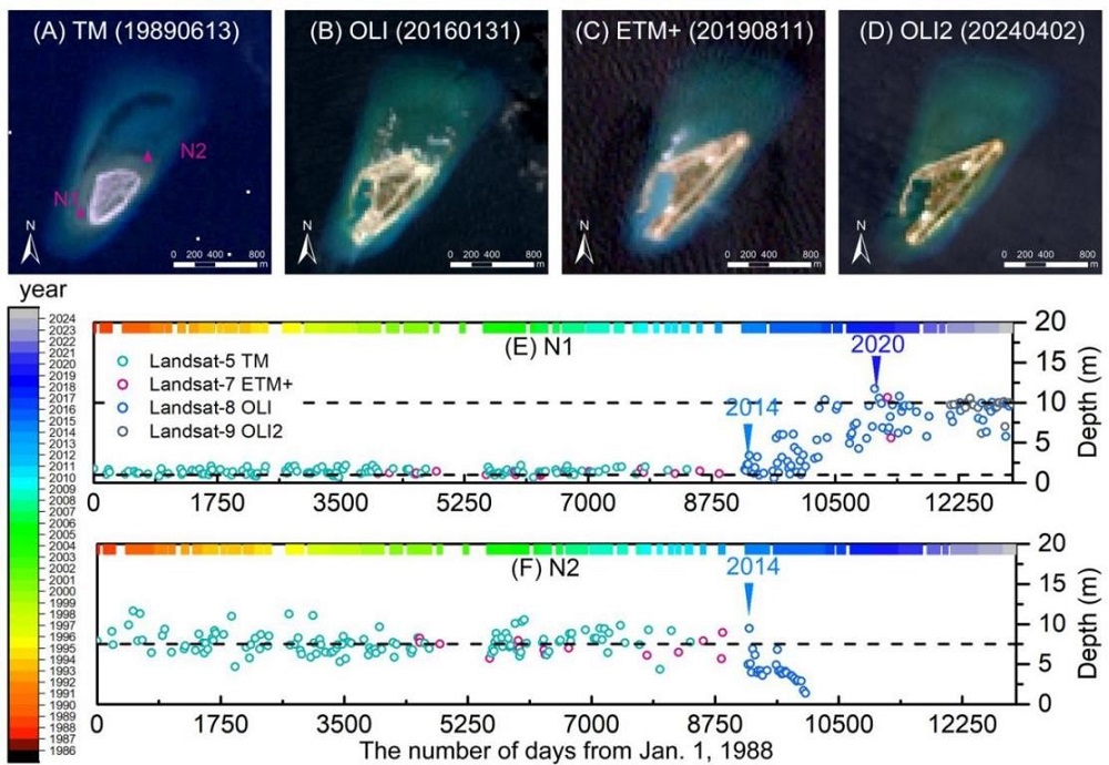 圖 3?基于Landsat-5/7/8/9的40年水深反演結果監測南沙南威島開發過程導致的淺水地形變化。(詳細請查看原文Liu et al. 2025,Int. J. Appl. Earth Obs.)