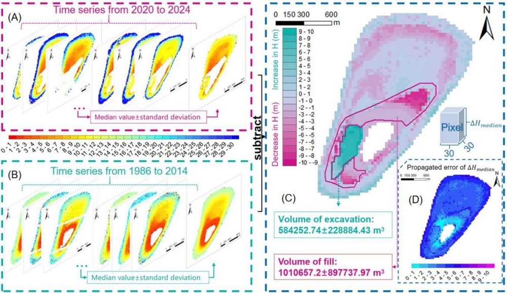 圖 4?基于Landsat-5/7/8/9的40年長時序水深反演結果評估南威島礁新增港口被發掘的沉積物體積和東北部填海造陸填埋的水體體積。(詳細請查看原文Liu et al. 2025,Int. J. Appl. Earth Obs.)