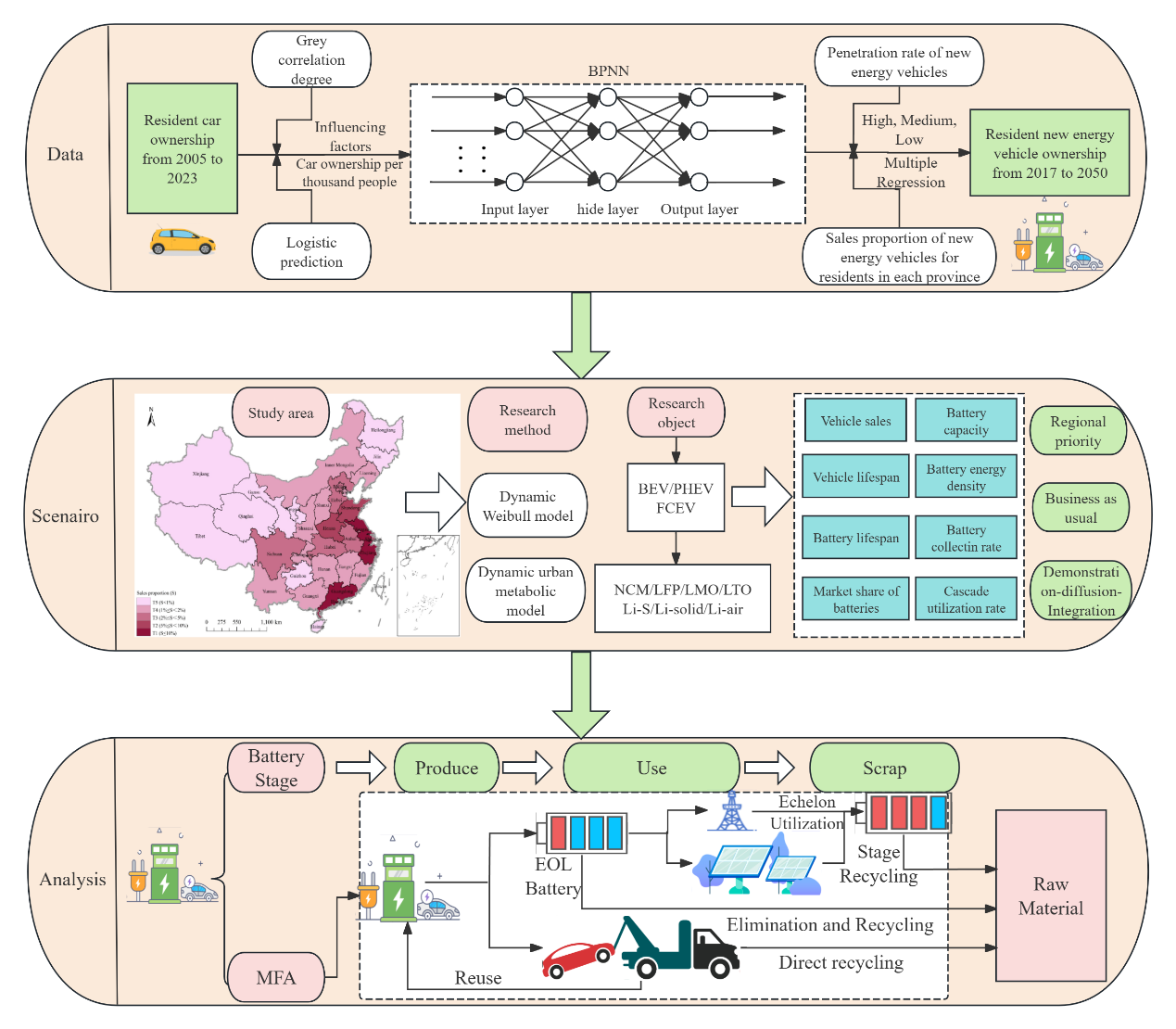 圖1:中國(guó)家用新能源汽車動(dòng)力電池管理研究框架:基于情景的梯次利用、儲(chǔ)能潛力與退役回收優(yōu)化路徑評(píng)估