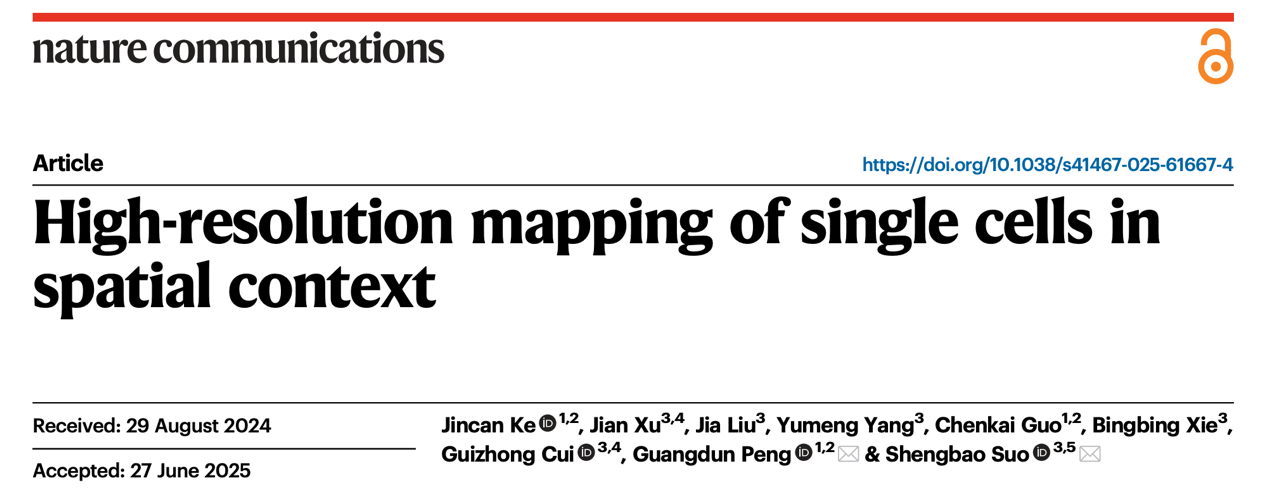 2025年7月15日,中國科學院廣州生物醫藥與健康研究院彭廣敦課題組和廣州國家實驗室索生寶課題組合作,在Nature Communications上發表了題為High-resolution mapping of single cells in spatial context的研究論文。